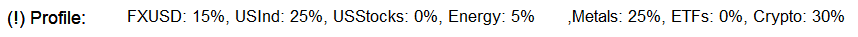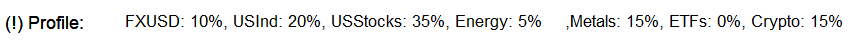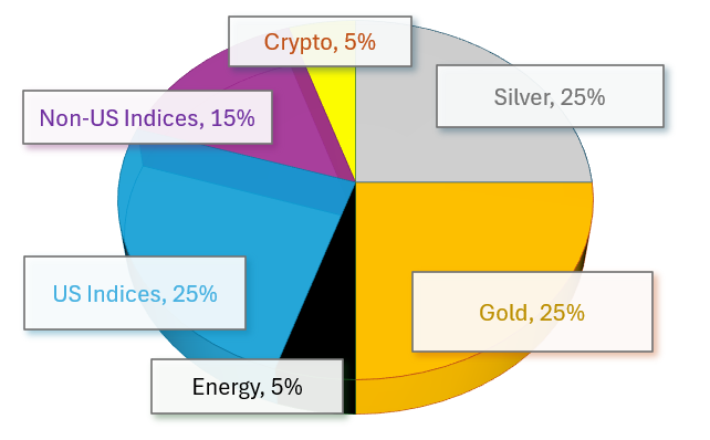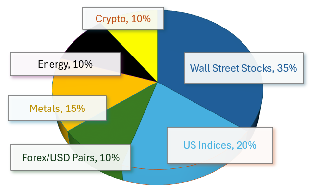 This strategy is designed to balance growth potential with risk management. By emphasizing U.S. equities and indices, it captures the momentum and liquidity of Wall Street while diversifying through commodities and forex to hedge against inflation, interest rate shifts, and geopolitical volatility.
