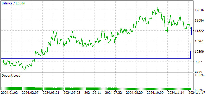 Since there is only one trade, the equity line reflects Gold’s price path, clearly showing that the year ended with a higher price. The price experienced a notable drawdown after October marking a drawdown figure of 10.25%.