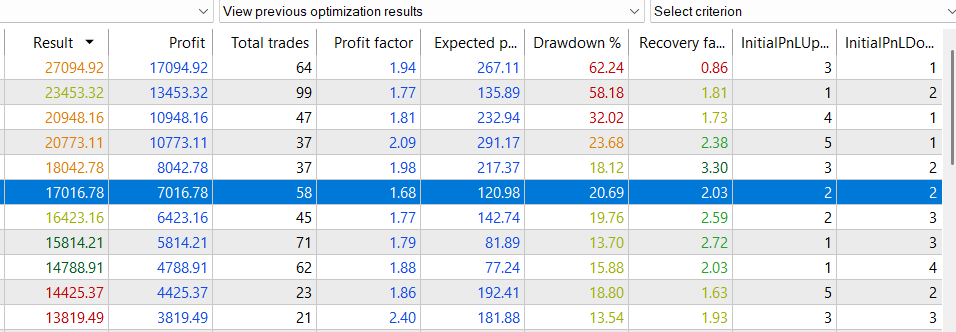 The MT5 optimization process results, considering the Martingale Scaling method, reveal a moderately profitable trading strategy with a total profit of 7,016 USD (70.16% ROI), across 58 trades. The expected payoff of 120.98 suggests consistent performance per trade. The drawdown of 20.69% is even better than other similar methods. The picture shows the alternate strategies arising when allowing for PnL Thresholds variations.