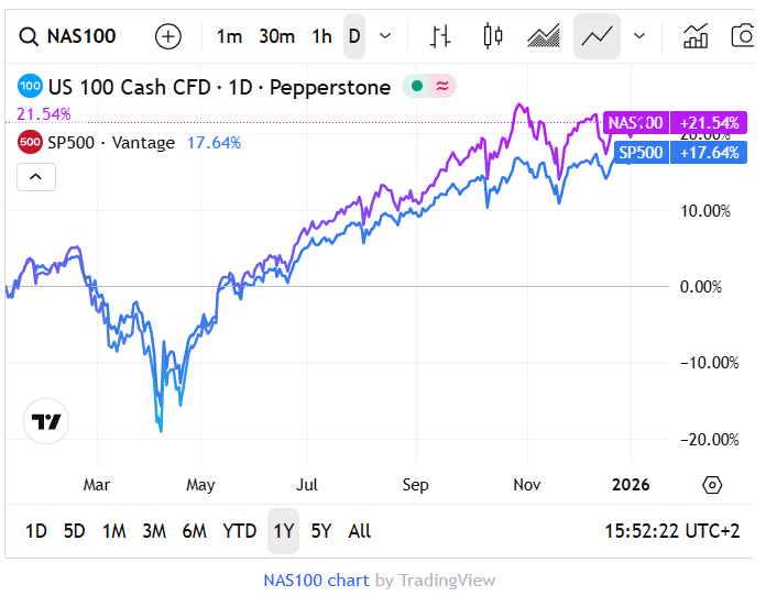 US Indices: Indices track a broad market or sector, reducing the risk tied to individual stock performance. The US500 index for example represents a broad range of companies across multiple sectors. Thus, combining the index with the stocks is reducing the risk that the portfolio is overly dependent on just a number of companies. This enhances risk management, provides broader exposure, and introduces strategic investment benefits.