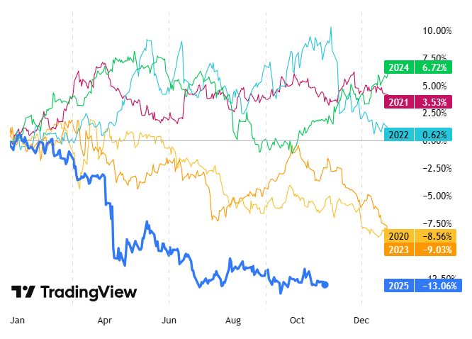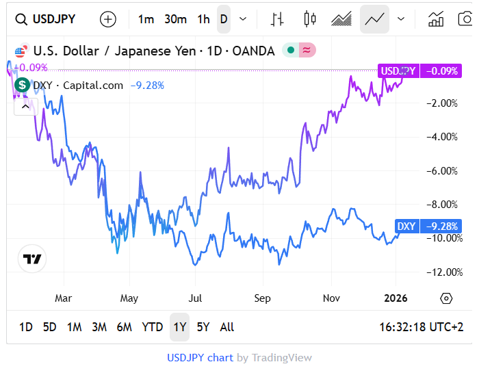 Sensitive to U.S.–Japan rate differentials and carry trade flows. BoJ’s hawkish tilt in 2025 pressured the pair. The pair fell by approximately –2.88% over the year.