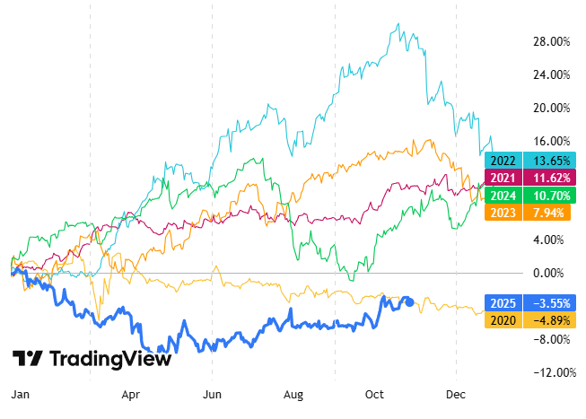 ♦ In 2025, interest rates in the U.S. remained high, while other central banks pursued aggressive rate cuts. Tariffs introduced by President Trump created significant uncertainty, causing stock markets to decline sharply until April. Although inflation was substantially reduced, labor market data began to reveal notable negative trends throughout the year. A government shutdown further fueled investor anxiety, triggering a risk-off sentiment. As a result, investors sought refuge in metals. Both stocks and cryptocurrencies were negatively impacted by the shutdown. Crude oil prices continued to decline.