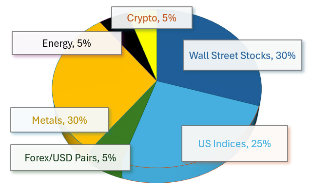 This strategy reflects a balanced, multi-asset approach designed to capture growth across traditional and alternative markets while managing risk through diversification. With over half the portfolio allocated to Wall Street stocks and U.S. indices, it leans into equity-driven growth, supported by global macro trends and corporate earnings. The inclusion of Forex and metals introduces defensive and inflation-hedging elements, while energy and crypto provide cyclical and speculative upside. The strategy is well-suited for investors seeking long-term capital appreciation with exposure to both stability and innovation.